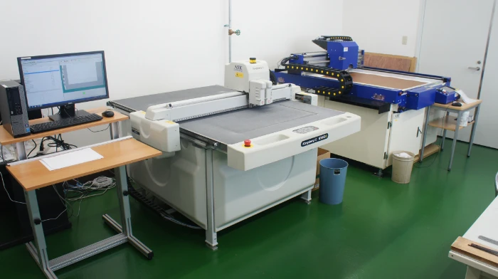 大内氏 「Kongsbergの用途は印刷とトムソンの抜きズレの事前検証、サンプルカットですが、弊社ではサンプルにおいても品質を最重視しています。 特に罫線はトムソンでの仕上がりにできるだけ近づけるため、以前は手作業による追い加工を行っており、時間がかっていました。 ArtiosCADには面切りを行う機能があるため、面切りをしたサンプルの生産が容易になりました。 Kongsbergの加工速度の速さも相まって100枚以上作成する量産サンプルにも簡単に対応できるようになりました。 おかげで今では面切りを入れたサンプルが標準となっています。製版用の割り付けも企画営業部で担当していますが、 隣にある製版部との割り付けデータのやり取りも、ArtiosCAD のおかげでスムーズに行えています。 面板も機械導入に合わせて内製化した部分ですが、データ作成・機械操作も簡単ですぐに立ち上げることができました」