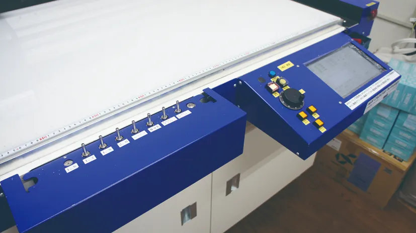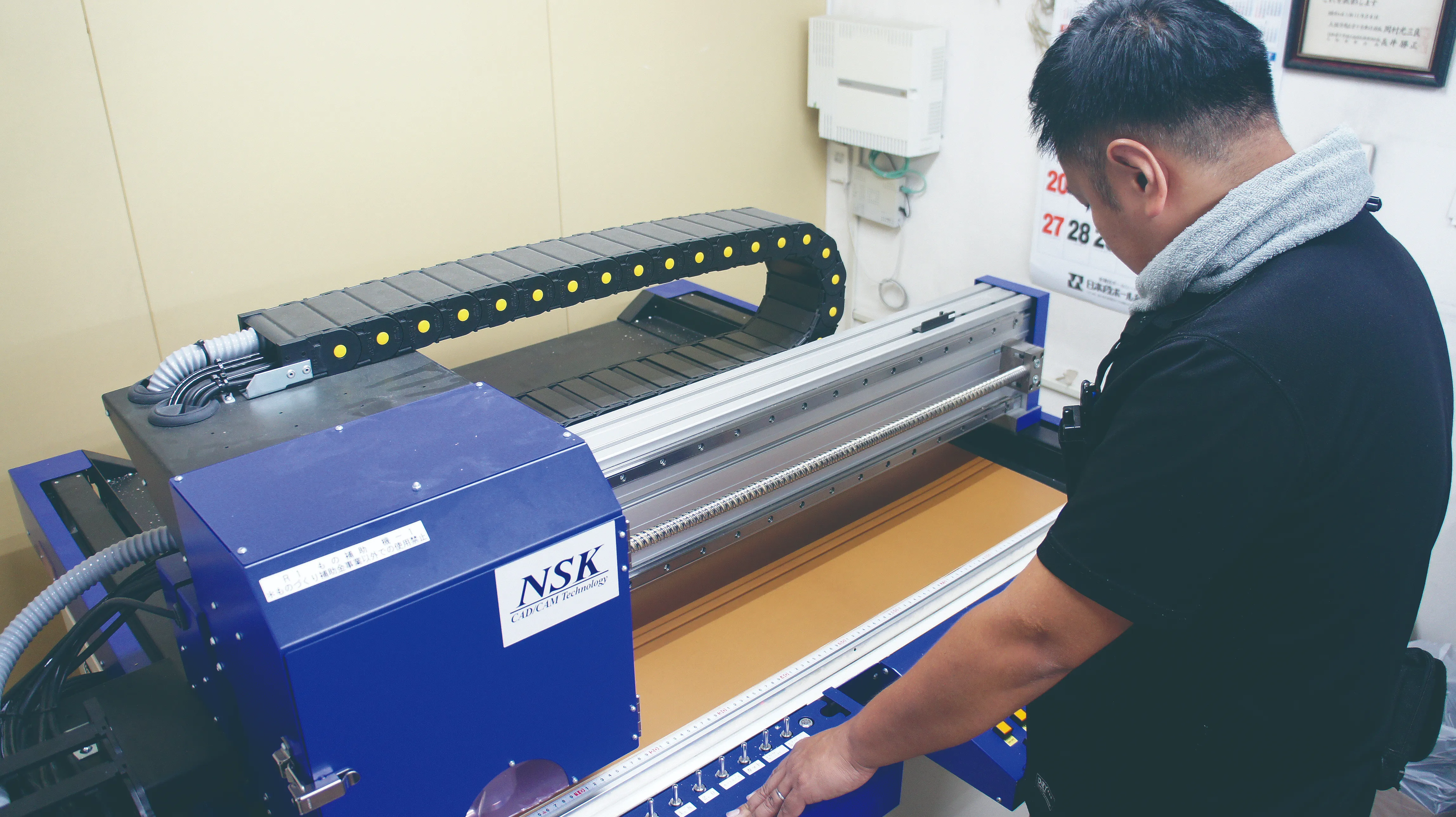 面板作成機 NS-Crease Line 8ATC の方も、加工パラメータが設定として保存でき、各ツールの高さもセンサーによる自動補正なので、 基本はデータを読み込んで出力指示を行うだけで、あとはツールチェンジも含めて全自動加工してくれます。 深さの精度も特別なメンテナンスなしにも関わらず導入から現在まで高精度を維持し続けてくれています。 最初はトムソンに面板を付ける作業で戸惑うこともありましたが、それもすぐに慣れました。