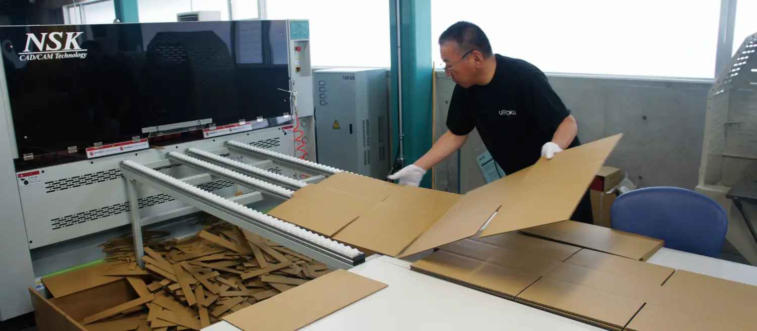 中辻氏 まず私自身がこういった加工機械を業務で使用することが初めてであり、導入前は私で扱えるのかが非常に不安でした。 しかしNSKのインストラクターによる丁寧な指導とフォローにより、3日間の初期指導で使いこなせるようになりました。 基本的な操作性については、本当に初心者でも扱えるほどの簡潔性を持っていると思います。 加工データについては形状とサイズ入力だけで段取りができ、よく使用するサイズものに関しては設定を保存しておくこともできるので、製造指示が来てから数秒後には生産を開始できます。 鋭利な刃物を搭載している機械ですが、安全性も十分考慮されているので、安心して使うことができます。 品質面においても、サイズの正確さはもちろんですが、段違い罫線機能により『逃げ』を考慮した箱ができるため、作図の知識がなくても組みやすくて美しい箱が簡単に作れます。 加工スピードも早く、1ケース6秒ほどでできるので急な生産指示にも十分対応できます。 ある程度の数を作る際も、ボトムフィーダー方式なので機械の加工中でもシートを追加供給でき、一人でも機械を止めることなく連続生産を行うことができます。
