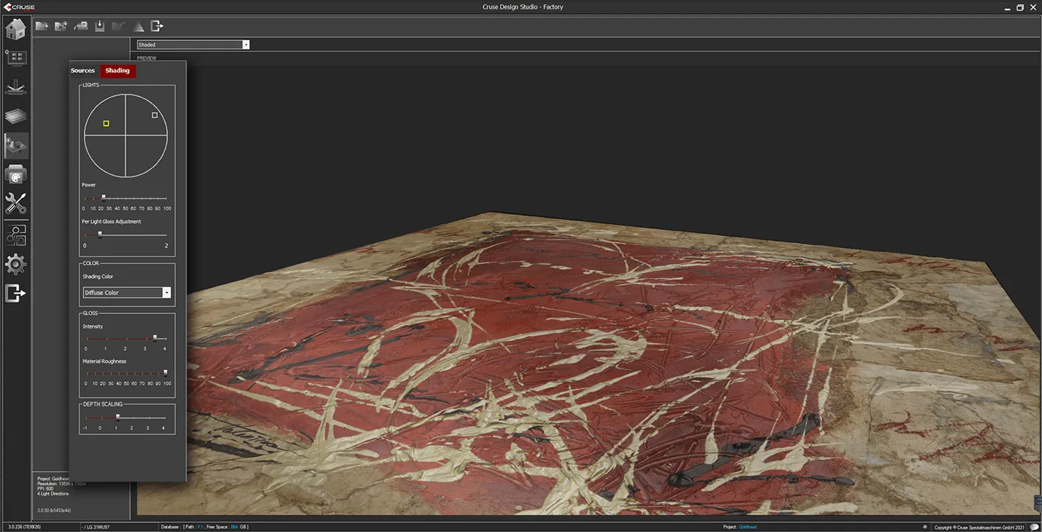 Factoryは超大型サイズのデータ処理を想定して設計されています。 大判スキャンの場合でも計算を行いながらリアルタイムでプレビューを表示し、ライティング・光沢・表面構造などのパラメータをその場で調整できます。